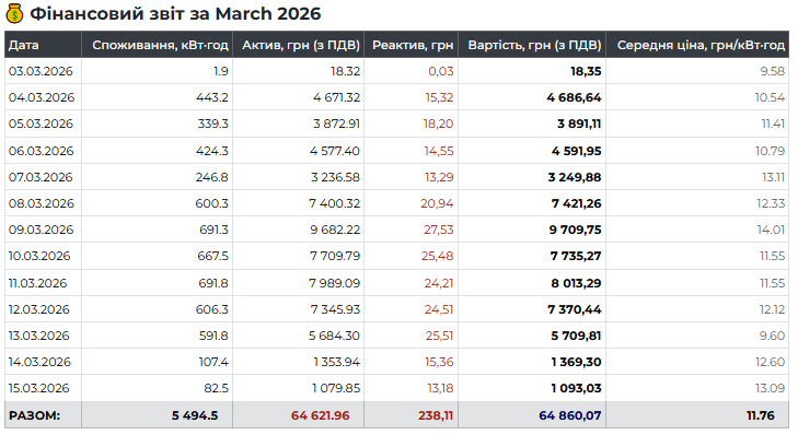 - Активна та реактивна енергія: Тепер ви бачите не лише активну енергію, а й витрати на реактив (з урахуванням штрафів за генерацію в мережу)